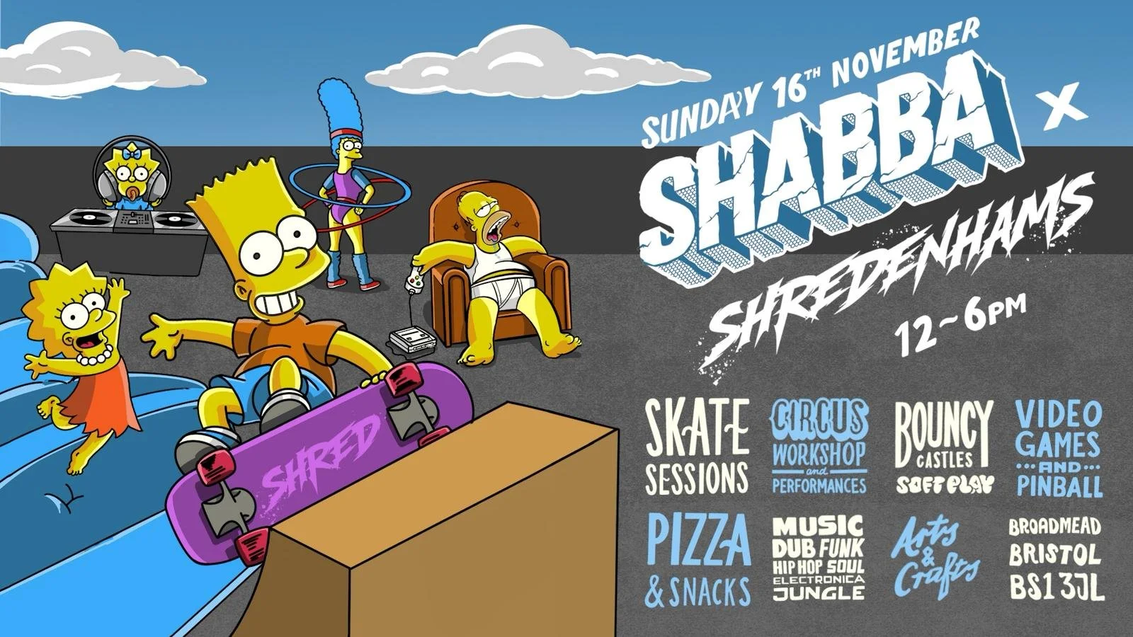 That’s right you lovely people of Bristol, the mighty Shredenhams skatepark have team up with the notorious North London DJ collective SHABBA to bring an all-action family event. They ain’t pulling no punches or adding hidden costs neither – it’s all in the ticket price baby! So, here’s what’s going down…